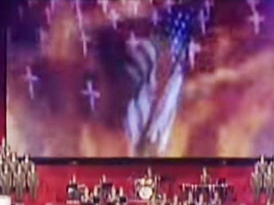 После имитации взрыва реет охваченный огнем флаг США, перекрыт изображением кладбища