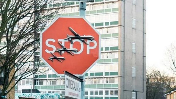 В пятницу на юге Лондона на красном дорожном знаке STOP появились три военных беспилотника