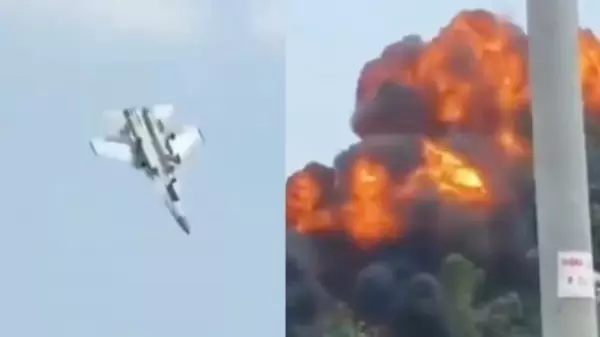 Пилот истребителя успел катапультироваться с парашютом. Истребитель почти вертикально вошел в землю и взорвался