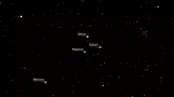 Сатурн, Венера и Нептун объединятся, образуя планетарный треугольник, а Меркурий будет находится слева