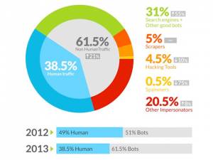 которые посещают веб-страницы для индексации.Их доля в общемировом трафике выросла на 55% — до 31%. 5% заняли так называемые скрейперы — боты, которые автоматически копируют контент с других сайтов. 4,5% пришлось на хакерских "пауков", а еще 20,5% — на других роботов, которые пытались притвориться настоящими людьми (DDoS-агенты, зараженные трояном браузеры и другие шпионы). Доля ботов-спамеров (во многом благодаря вводу Google алгоритма Penguin, который делает спам бессмысленным в качестве метода поисковой оптимизации) сократилась на 75%: с 2% в 2012 году до всего 0,5% в 2013-м. Нужно учесть, что Incapsula, предлагающая решения в области компьютерной безопасности, собирала статистику по 20 тысячам сайтов своих клиентов. Так что цифры компании сложно экстраполировать на весь Интернет — в конце концов, не каждый сайт регулярно сталкивается с DDoS-атаками. С другой стороны, данные отлично показывают, что число искусственных посещений сайтов в Сети продолжает расти. | |