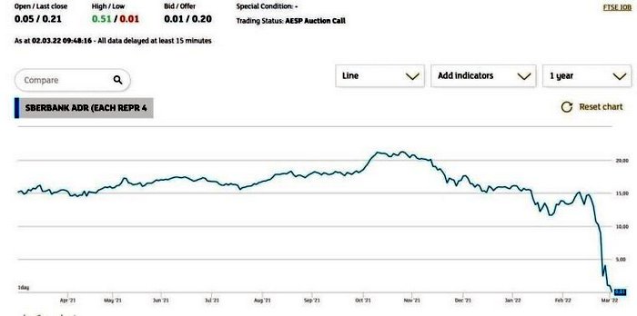 ![]() Фото: из открытых источников Цена акций российского Сбербанка на Лондонской бирже 2 марта опустилась до 1 цента.