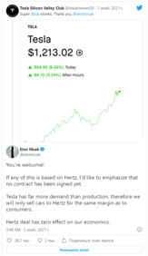 Акции Tesla упали на 5,5% после того, как глава компании Илон Маск объявил, что контракт с Hertz на 100 тысяч электромобилей еще не заключен. Об этом сообщает Reuters во вторник, 2 ноября.Отметим, что на прошлой неделе капитализация Tesla впервые перешагнула отметку в 1 трлн долларов на фоне сообщений о том, что один из крупнейших в мире сервисов аренды автомобилей Hertz закажет 100 тысяч электромобилей на 4,2 млрд долларов. Тем не менее, по словам Маска, контракт все еще не подписан. Он добавил, что сейчас спрос на Tesla намного превышает производственные возможности компании, поэтому в Hertz не могут рассчитывать на скидку даже с оглядкой на рекордный заказ. | |