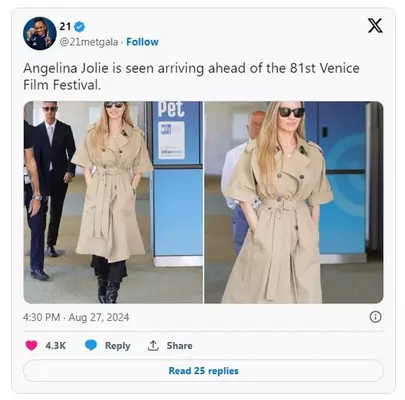 Американская актриса Анджелина Джоли кардинально изменила имидж: ее волосы стали на несколько тонов светлее. Об этом пишет Vogue. 49-летняя актриса была замечена в новом образе в Венеции, куда она прибыла для участия в кинофестивале, который стартует уже сегодня, 28 августа. На фестивале Джоли представит фильм "Мария Каллас", где сыграла главную роль. На публике она появилась в песочном тренче с укороченными рукавами, широких черных брюках и черных сапогах на каблуке. Ее волосы были распущены, а глаза скрыты за темными очками. К слову, в последние несколько лет внимание в сети сосредоточено не на фильмах с участием Анджелины, а на ее продолжающихся судебных разбирательствах с бывшим мужем Брэдом Питтом. Кстати, Питт тоже собирается приехать на кинофестиваль, но их встреча там маловероятна. | |