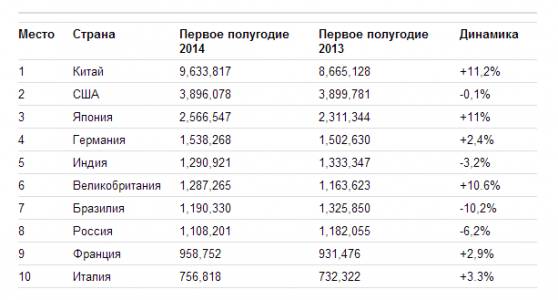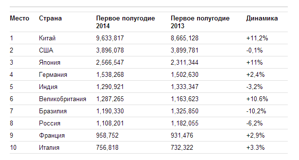 За первые шесть месяцев 2014 года Россия по итогам продаж новых автомобилей оказалась на восьмом месте среди лидеров мирового авторынка и при этом потеряла одну позицию.