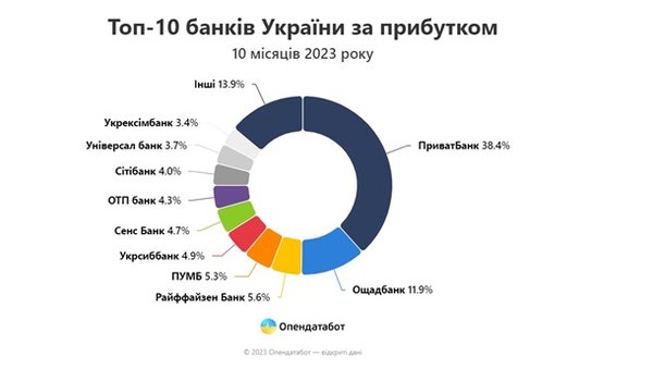 За 10 месяцев 2023 года украинские банки заработали 122,7 млрд гривен. Это более чем в два раза больше за соответствующий период 2021 года, когда прибыль составила 58,35 млрд. Об этом в четверг, 7 декабря, сообщила платформа открытых данных Опендатабот со ссылкой на данные Нацбанка. Указано, что всего четыре банка в Украине получили убытки в размере 99 млн гривен. Топ-10 банков по прибыли имеет незначительные изменения: частный Универсал банк (Монобанк), выбывший из рейтинга весной, вернулся с рекордной прибылью, сдвинув государственный Укргазбанк. Государственные ПриватБанк и Ощадбанк заработали половину общей прибыли всех украинских банков за 10 месяцев 2023 года. Выросли и их доходы - вдвое у ПриватБанка (47,1 млрд) и в 19 раз - у Сбербанка (14,58 млрд). Доля прибыли государственных банков составляет 61% - на 11% больше, чем в 2021 году. Все 14 банков с иностранным капиталом вышли в плюс по результатам 10 месяцев 2023 года. Общая прибыль группы составила 30,43 млрд грн - в 1,6 раза больше, чем за соответствующий период 2021 года. Зато же доля иностранных банков в общей прибыли уменьшилась до 25%. Среди банков с иностранным капиталом лидирует Райффайзен банк (6,89 млрд). Его прибыль в этом году в 1,7 раза превышает показатели 10 месяцев 2021 года. Банки с частным капиталом за 10 месяцев 2023 года увеличили свою прибыль в 1,7 раза по сравнению с 2021 годом. Доля прибыли банков этой группы в этом году уменьшилась до 14%. Лидером группы остается ПУМБ с прибылью в 6,48 млрд грн - почти вдвое больше соответствующего показателя 2021 года. Универсал банк, входящий в группу банков с частным капиталом, получил рекордную прибыль за октябрь - 1,7 млрд грн и сумел вернуться в топ-10 банков страны. Именно на эти два банка приходится почти 2/3 прибыли группы. | |