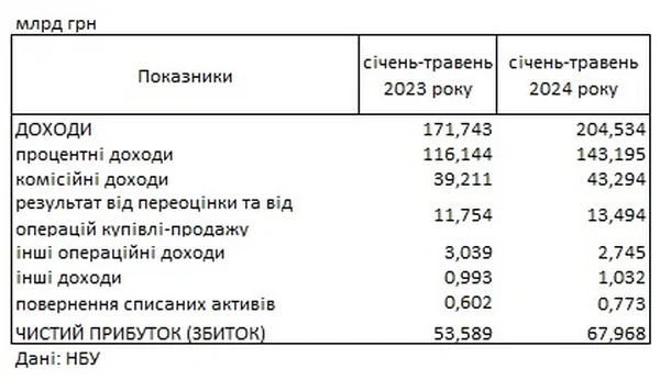 Чистая прибыль после налогообложения платежеспособных банков Украины за январь-май 2024 года составила 67,968 млрд гривен, что на 26,8% больше, чем за аналогичный период прошлого года. Об этом сообщила пресс-служба Национального банка Украины. По данным регулятора, доходы банков за январь-май выросли на 19% до 204,534 млрд гривен, при этом процентные доходы выросли на 23,3% до 143,195 млрд гривен.