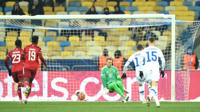В матче пятого тура группового этапа Лиги чемпионов киевское Динамо на своем поле принимало мюнхенскую Баварию.У немецкого гранда перед этим поединком было немало проблем с кадровым составом, да и поражение в чемпионате Германии не добавляло команде оптимизма. У киевлян был реальный шанс навязать сопернику борьбу и попытаться взять очки. Несмотря на проблемы, гости достаточно активно начали встречу и ринулись в атаку. Впрочем, через несколько минут после начала арбитр вынужден был приостановить игру из-за выбежавшего на поле полуголого фаната. Сразу после возобновления встречи Динамо ринулось к воротам соперника и провело несколько неплохих атак, однако в ворота мяч так и не залетел. Зато Бавария сумела выйти вперед на 14-й минуте – от ноги Забарного мяч полетел вверх в штрафной киевлян и Левандовски отправил его в сетку ударом через себя. Подопечные Луческу быстро оправились от пропущенного мяча и пытались отыграться. Отличный шанс был у Цыганкова на 29-й минуте – Виктор пробил, но Горецка успел подставить ногу и мяч полетел к Нойеру. Вратарь хотел выбить его ногой, но обрезался – от гола Баварию спасла штанга. Через несколько минут Цыганков вновь был близок к голу – он сместился справа в центр и пробил по воротам, но Нойер поймал мяч в руки. После этого был момент с возможным пенальти – Буяльский оказался на газоне в результате борьбы с Эрнандесом, но арбитр не указал на "точку". На 42-й минуте поединка гости удвоили преимущество – Толиссо выполнил заброс на правый фланг, Мюллер в прыжке пропустил этот мяч между ног и "круглый" оказался у Комана, который с острого угла расстрелял ворота Бущана – 0:2. Уже на старте второй половины встречи Динамо могло отыграть один мяч – Шапаренко нанес удар по воротам, но Нойер был на месте, затем Николай сыграл на добивании, и вновь Нойер спас. После этого у киевлян был отличный шанс забить со штрафного, но Шапаренко ударом с острого угла пробил над перекладиной. Киевляне продолжали атаковать и, в итоге, мяч оказался в воротах Баварии. На 70-й минуте Гармаш после передачи от Цыганкова пробил низом – 1:2. Этот гол стал первым для "бело-синих" в нынешнем розыгрыше Лиги чемпионов. Последние 20 минут поединка чемпионы Украины пытались забить еще и у них было несколько отличных моментов, но все же больше поразить ворота Нойера не удалось. Бавария с трудом доигрывала встречу, но удержала победный счет. Таким образом, после пяти туром мюнхенцы продолжают возглавлять группу Е, имея 15 очков в активе. Динамо остается на последней строчке, набрав 1 балл. В заключительном туре группового этапа Лиги чемпионов киевляне сыграют на выезде против Бенфики, а Бавария на своем поле примет Барселону. Оба поединка состоятся 8 декабря. Динамо – Бавария – 1:2