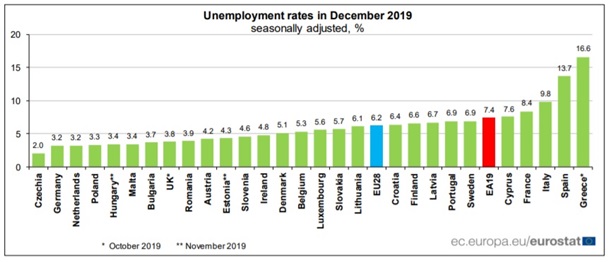 Уровень безработицы в 28 странах-членах Евросоюза в декабре 2019 года составил 6,2%. Это самый низкий показатель с января 2000 года, сообщил накануне Евростат.Так, уровень безработицы в странах еврозоны составил 7,4%, и это самый низкий показатель, зафиксированный в еврозоне с мая 2008 года. По сравнению с ситуацией годом ранее количество безработных снизилось на 747 тысяч в ЕС и на 592 тысячи в еврозоне. Среди стран ЕС самый низкий уровень безработицы в декабре 2019 года зафиксирован в Чехии (2,0%), а также в Германии и Нидерландах (обе 3,2%). Самые высокие показатели безработицы наблюдались в Греции (16,6% в октябре 2019), Испании (13,7%) и Италии (9,8%). ![]() | |