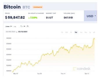 Стоимость популярной криптовалюты Bitcoin впервые достигла отметки в $60 000. Рыночная стоимость криптовалюты снова восстановилась до $1 трлн, сообщает Bloomberg.Стоимость криптовалюты растет на фоне ожиданий касательно ее широкого внедрения и признания. Также росту способствовало подписание закона о борьбе с пандемией на сумму $1,9 трлн президентом США Джо Байденом. По состоянию на 16:23 по Киеву 13 марта стоимость биткойна составляла $59 847 (+7,33%). С 2020 года стоимость биткойна выросла примерно на 1000%. | |