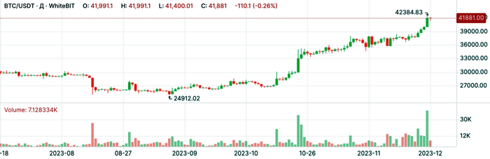 Биткоин, во вторник, 5 декабря, достиг рекордной отметки в 41,8 тысяч долларов. Об этом сообщает РБК-Украина со ссылкой на данные одной из крупнейших европейских криптобирж WhiteBIT. Биткоин достиг отметки 41 881 долларов - самого высокого уровня почти за полтора года. Самая крупная и известная криптовалюта в мире выросла на 51,1% по сравнению с годовым минимумом в 26 533 долларов, зафиксированным 11 октября 2023 года. Сегодняшний показатель несколько ниже своего рекордного максимума в 63 000 долларов в апреле 2021 года. Общая рыночная капитализация криптовалют в сутки, по данным CoinMarketMap, оценивается в 1,52 трлн долларов. Ethereum (ETH) торгуется на уровне 2,21 тысячи долларов. Другие активы по топ-10 по капитализации также преимущественно находятся в основном в "красной" зоне, согласно данным WhiteBIT. В частности, WBT - 5,471 долл., ADA - 0,399 долл., XRP - 0,61 долл. | |