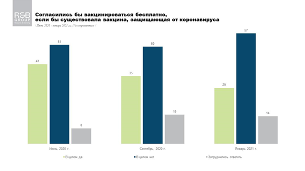 Более половины украинцев (57%) не согласились бы вакцинироваться от COVID-19, даже если бы это можно было сделать бесплатно. При этом согласны на вакцинацию лишь 29%. Об этом свидетельствуют результаты опроса компании Research & Branding Group.Еще 14% опрошенных не определились в данном вопросе. При этом среди тех, кто согласен вакцинироваться, 44% предпочли бы сделать это бесплатно. Однако, если бы прививка была платной, то 25% опрошенных не смогли определился, какую цену на нее сочли бы приемлемой. Среди озвученных сумм чаще всего (в 10% случаев) назывался интервал в пределах 300-500 грн. Меньшие суммы считают приемлемыми 13% опрошенных: 6% - до 100 грн и 7% - до 300 грн. Больше готовы заплатить 9% опрошенных: 5% - до 1000 грн, 3% - до 1500 грн и 1% - более 1500 грн. ![]() ![]()