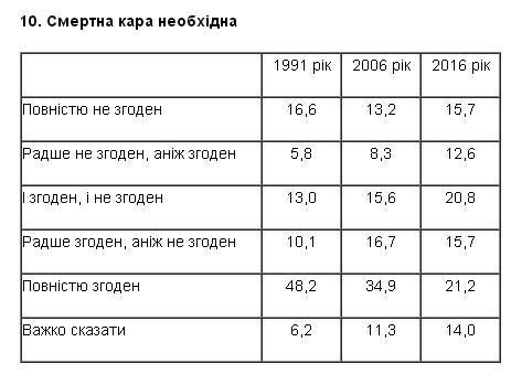 В Украине 36,9% опрошенных фондом Демократические инициативы и Киевским международным институтом социологии (КМИС) выступили за возобновление смертной казни в Украине. Об этом свидетельствуют результаты опроса.В частности 21,2% респондентов полностью согласны с утверждением, что смертная казнь необходима, а 15,7% - скорее согласны, чем не согласны. В то же время 15,7% респондентов полностью не согласны с этим утверждением, 12,6% - скорее не согласны, чем согласны, а 20,8% и согласны и не согласны. 14% респондентов затруднились ответить. Опрос проводился с 4 по 19 августа. Было опрошено 2 040 респондентов старше 18 лет в 110 населенных пунктов всех областей, кроме аннексированного Крыма (в Луганской и Донецкой областях исследование проводилось только на подконтрольных украинским властям территориях). | |