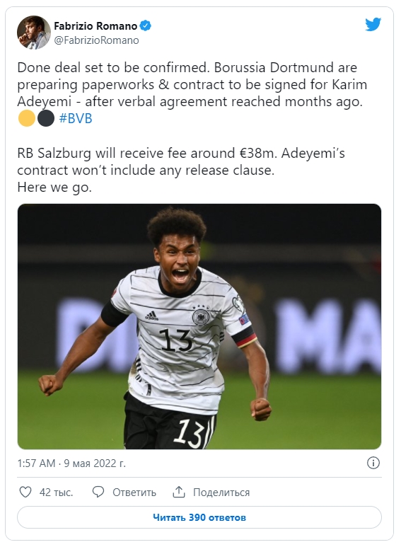 Боруссия Дортмунд уже нашла замену норвежскому нападающему Эргингу Холанну. Как сообщают журналисты Никола Скира и Фабрицио Романо, немецкий клуб не стал изобретать велосипед и вновь обратил свои взоры на австрийский Зальцбург. Именно из этого клуба в Дортмунд перебрался Холанн. Теперь же, по тому же пути, проследует Карим Адейеми. СМИ сообщают, что стороны уже согласовали сумму трансфера и в ближайшее время нападающий подпишет контракт со "шмелями". Боруссия заплатит за 20-летнего игрока 38 млн евро. По имеющимся сведениям, в контракте игрока не будет пункта о возможном выкупе. Отметим, что в этом сезоне Адейеми сыграл за Зальцбург 42 матча, в которых забил 23 гола и отдал 7 результативных передач во всех турнирах. | |