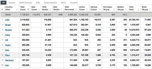 Бразилия вышла на второе место в мире по смертности от коронавируса. По состоянию на субботу, 13 июня, там умерли уже 41 901 человек, свидетельствуют данные сайта Worldometers.Первое место по-прежнему у США - 116 825 умерших. По числу выявленных случаев заражения Бразилия на втором месте - 828 810 инфицированных. ![]() Всего в мире коронавирусом заразились 7 739 831 человек, 428 337 заболевших скончались, 3 966 262 человека - выздоровели. | |