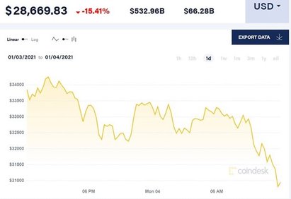 Стоимость самой популярной криптовалюты биткоина резко упала и опустилась ниже 29 тысяч долларов. Об этом свидетельствуют данные CoinDesk утром 4 января.При этом от исторического максимума в 34 778 долларов криптовалюта потеряла уже более 15%. Сейчас общая стоимость рыночной капитализации биткоина равняется свыше $532 млрд. Падение за сутки составило более 66 млрд долларов. Его доля занимает более 70% всего глобального рынка криптовалют. Напомним, стоимость криптовалюты резко выросла в последние месяцы. Еще в начале октября биткоин стоил около 11 тысяч долларов. С начала 2020 года криптовалюта подорожала в три раза на фоне активного притока институциональных инвесторов в криптовалюты. По данным аналитиков рынка, аппетит к рискованным активам, которые являются криптовалюты, поддерживают масштабные вливания Федеральной резервной системы США и центробанков других стран, а также растущие ожидания, что пандемия коронавируса будет взята под контроль благодаря вакцинам. | |