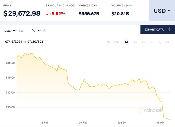 Самая популярная криптовалюта биткоин существенно потеряла в цене, опустившись ниже психологической отметки в 30 тысяч долларов. Об этом сообщает CoinDesk во вторник, 20 июля.Так, по состоянию на 7:45 по Киеву цена биткоина упала на 6,52% и достигла уровня 29 672 долларов. Общая стоимость рыночной капитализации биткоина обвалилась до почти 557 млрд долларов. Падение капитализации за сутки составило около 21 млрд долларов. | |
