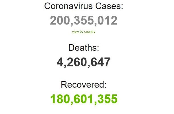 Число случаев коронавируса в мире по состоянию на среду, 4 августа, превысило 200 миллионов, свидетельствуют данные Worldometer.