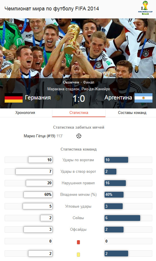 В финальном матче Чемпионата мира по футболу 2014 года в сборная Германии одержала победу над сборной Аргентины со счетом 1:0.В основное время футбольного поединка, ни одна из команд не смогла забить гол в врата соперника. Игра перешла в овертайм с дополнительными двумя таймами по 15 минут. На 113-й минуте игры, футболист Германии Марио Гётце вывел сборную вперед, получив передачу от Андреа Шюррле. СправкаСборная Германии по футболу уже в 4-й раз становится футбольным чемпионом мира. Ранее, Германия получила титул чемпиона в 1954, 1974 и 1990 годах.Кроме того, Германия стала первой европейской футбольной командой, которая выигрывает чемпионат мира в Америке. Этот чемпионат 2014 года стал 8-м по счету в Америке. 2 раза чемпионат провели Мексика и Бразилия, по одному США, Уругвай, Чили и Аргентина. | |