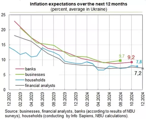 Рост цен в Украине в течение ближайших 12 месяцев замедлится. Такие прогнозы дают финансовые аналитики, банкиры, руководители предприятий и население. Об этом сообщает РБК-Украина со ссылкой на данные Национального банка Украины (НБУ). В декабре 2024 года финансовые аналитики ожидают инфляцию через год на уровне 7,2%. Это лучше предыдущего прогноза за октябрь (7,6%). По информации НБУ, население в ноябре прогнозировало инфляцию 7,8%. Это ниже, чем в октябре - 8,1%. Украинские банкиры в октябре ожидали рост цен через 12 месяцев на уровне 9,2%. Это выше предыдущего прогноза за июль на уровне 8,7%. Руководители предприятий ожидают инфляцию 9,7% (данные за август). Рост цен в УкраинеНапомним, по данным Госстата, рост потребительских цен в Украине в октябре составил 1,8%. Годовая инфляция достигла 9,7%. По оценкам НБУ, инфляция в Украине в ноябре уже превысила 10%. По данным НБУ, продовольственная инфляция стремительно ускорилась из-за эффектов жаркой погоды без дождей летом и осенью текущего года, что сказалось на урожайности, сроках созревания и качественных параметрах продовольственной продукции, в первую очередь, ряде овощей и фруктов. В НБУ ожидают, что уже к концу года инфляция может превысить 10%, однако инфляция пойдет на убыль весной 2025 года, а в конце 2025 года составит 6,9%. | |