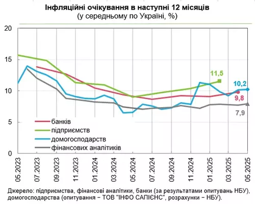 Прогнозы по инфляцииПо данным Госстата, в мае 2025 года инфляция в Украине ускорилась до 15,9% в годовом измерении. Цены росли с опережением прогноза Национального банка. Отклонение обусловлено прежде всего стремительным подорожанием сырых продуктов питания вследствие неблагоприятных погодных условий весной и активного экспорта продовольствия Согласно прогнозу НБУ летом инфляция должна вернуться на траекторию снижения и уже в конце года упасть ниже 10%. НБУ в апреле ухудшил прогноз по росту потребительских цен в Украине в 2025 году до 8,7%. По прогнозу НБУ, летом рост цен в годовом измерении начнет замедляться по широкому спектру товаров и услуг. | |