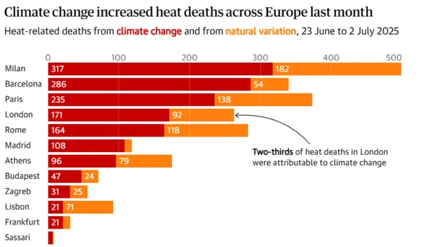 Ученые подсчитали, что в 12 крупных городах жертвами рекордно высоких температур стали 2300 людей. 1500 смертей из зафиксированных 2300 они связывают с климатическими изменениями, которые привели к нагреванию планеты и усилению экстремальных температур, пишет The Guardian со ссылкой на исследование ученых. Экспресс-анализ был проведен группой World Weather Attribution и охватил 10 дней, закончившихся 2 июля, в течение которых обширные территории Западной Европы были накрыты жарой. Ученые использовали эпидемиологические модели для оценки смертности, связанной с жарой, в таких городах, как Париж, Лондон, Мадрид и Рим и сравнили число погибших с данными гипотетического мира, в котором люди не нагревали планету, сжигая ископаемое топливо или уничтожая природу Полученные результаты четко указывают, что в двух третях случаев смерти виноваты климатические изменения. Из-за изменения климата температура в некоторых городах выросла на 4 градуса Цельсия, что привело к увеличению числа смертей на 1500 человек. Число погибших превысило число жертв в результате других недавних погодных катастроф, усугубленных загрязнением ископаемым топливом, таких как наводнения в Испании в 2024 году, унесшие жизни 224 человек, и наводнения в северо-западной Европе в 2021 году, жертвами которого стали 243 человека. Печальную статистику возглавляет Милан, где из 499 смертей от жары 317 были связаны с климатическими изменениями. За ним следуют Париж и Барселона. В Лондоне зарегистрировано 273 смерти от жары, 171 из которых исследователи связывают с влиянием человека на климат.