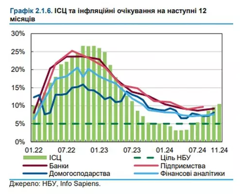 В ноябре 2024 года годовая инфляция Украины выросла до 11,2%. Цены будут расти темпами выше 10% еще по крайней мере полгода. Об этом сообщает РБК-Украина со ссылкой на"Отчет о финансовой стабильности" НБУ. Как отмечается в отчете, в ускорение инфляции прежде всего вызвано подорожанием продовольственных товаров вследствие летней засухи и неурожаев. Подорожание сырья привело к повышению цен на готовую продукцию, прежде всего пищевой промышленности. Также бизнес частично отразил в ценах повышение стоимости электроэнергии, рост расходов на оплату труда и ослабление курса гривны в течение года.