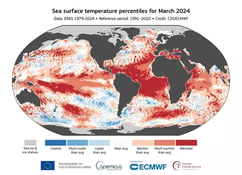 Средняя температура приземного воздуха в марте 2024 года составила 14,14 градусов, что на 0,1 градусов выше предыдущего максимума, установленного в марте 2016 года. Это десятый месяц подряд, который является самым теплым в мире за всю историю наблюдений. Об этом сообщает РБК-Украина со ссылкой на программу Европейского Союза по наблюдению за Землей Copernicus. Месяц был на 1,68 градусов теплее, чем предполагаемая температура в марте в среднем за 1850-1900 годы, который называется "доиндустриальный базисный период". Среднемировая температура за последние двенадцать месяцев (апрель 2023 года - март 2024 года) является самой высокой за всю историю наблюдений: на 0,70 градусов выше среднего показателя за 1991-2020 гг. и на 1,58 градусов выше среднего в 1850-1900 гг. Средняя европейская температура в марте 2024 года была на 2,12 градусов выше средней температуры марта 1991-2020 годов, что сделало этот месяц вторым самым теплым мартом за всю историю континента, всего на 0,02 градусов холоднее, чем в марте 2014 года. Наиболее высокая температура была выше средней в марте 2024 года центральных и восточных регионах. "Температура воздуха была выше средней на большей части океана, хотя условия Эль-Ниньо продолжали ослабевать в восточной экваториальной части Тихого океана", - говорится в сообщении. Причины рекордного теплаКак пишет The Guardian, температура временно превышает целевой показатель в 1,5 градусов от доиндустриального уровня, установленный в качестве цели Парижского климатического соглашения, но это соглашение не будет считаться нарушенным, если эта тенденция не сохранится в десятилетнем масштабе. Однако резкое повышение температуры за последний год удивило многих ученых и вызвало опасения по поводу возможного ускорения потепления. Диана Юрге-Ворзац, один из заместителей председателя Межправительственной группы экспертов ООН по изменению климата (МГЭИК), отметила, что за последние 15 лет планета нагревалась со скоростью 0,3 градусов в десятилетие, что почти вдвое превышает показатель в 0,18 градусов за десятилетие. тенденция с 1970-х годов. "Находится ли это в пределах изменчивости климата или сигнала об ускорении потепления? Меня беспокоит то, что может быть слишком поздно, если мы просто подождем и посмотрим", - написала она в Twitter. Директор Института космических исследований имени Годдарда NASA Гэвин Шмидт, отметил, что температурные рекорды побиваются каждый месяц на 0,2 градусов.