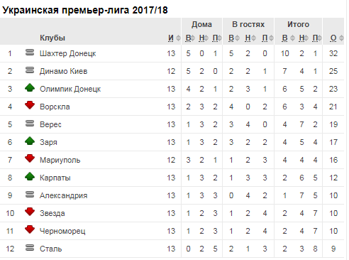 В центральном матче 13-го тура украинской Премьер-лиги киевское Динамо и донецкий Шахтер разошлись нулевой ничьей. Таким образом, Шахтер сохранил за собой первое место в турнирной таблице и опережает Динамо на семь очков.В другом матче воскресенья Сталь из Каменского поделила очки с одесским Черноморцем, сыграв вничью 1:1. Первыми на 52-й минуте вперед вышли гости, но Сталь спустя 10 минут сумела сравнять счет, забив гол с пенальти. В воскресенье также состоялся матч между Мариуполем и Зарей, который завершился разгромной победой гостей 2:5. Стоит отметить, что почти весь второй тайм Мариуполь играл вдесятером: на 49-й минуте за вторую желтую карточку был удален защитник Сергей Вакуленко. Результаты дня:Динамо - Шахтер 0:0Сталь - Черноморец 1:1 Голы: Васин, 52 - Малакян, 62 (с пенальти) Мариуполь - Заря 2:5 Голы: Белый, 6; Кожанов, 31 - Андриевский, 30, Гречишкин, 35 (с пенальти); Андриевский, 38; Андриевский, 63; Опанасенко, 91. Турнирная таблица:![]() | |