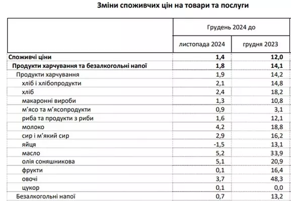 Средние цены на продукты питания и безалкогольные напитки в Украине в декабре 2024 года по сравнению с декабрем прошлого года выросли на 14,1%. Не изменились цены только на сахар. Об этом сообщает РБК-Украина со ссылкой на Государственную службу статистики (Госстат). По данным статистического ведомства, за последний год среди продуктов больше всего подорожали овощи - на 48,3% и сливочное масло - на 33,9%. Подсолнечное масло подорожало за год на 20,9%, молоко - на 18,8, хлеб - на 18,2%. Цены на фрукты выросли на 16,4%, на сыр и творог - на 16,2%, на хлеб и хлебопродукты - на 14,8%, безалкогольные напитки - на 13,2%, на яйца - на 13,1%, Рыба и продукты из рыбы подорожали на 12,1%, макаронные изделия - на 10,8%, мясо и мясопродукты - на 3,1%. Цены на сахар не изменились за год. Продуктовая инфляция в УкраинеПо данным НБУ, продовольственная инфляция стремительно ускорилась из-за эффектов жаркой погоды без дождей летом и осенью текущего года, что сказалось на урожайности, сроках созревания и качественных параметрах продовольственной продукции, в первую очередь, ряде овощей и фруктов. По данным продовольственного агентства ООН (ФАО), в декабре 2024 года мировые оптовые цены на основные продукты питания были на 6,7% выше своего значения годом ранее В конце года международные котировки на сливочное масло продемонстрировали самое большое падение, завершив 14-месячную серию непрерывного роста из-за сдержанного мирового спроса и накопленных запасов. | |