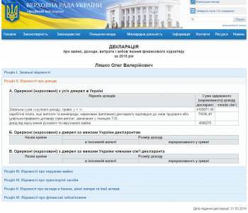 Лидер Радикальной партии Олег Ляшко задекларировал 4,17 млн грн доходов за 2015 год. Соответствующие данные опубликованы на сайте Верховной Рады.Из указанной суммы зарплата составила 79,6 тыс. грн, еще 4,1 млн грн задекларированы как доход от отчуждения имущества. В собственности политика - земельный участок площадью 1,26 га, две квартиры площадью 95,5 кв. м и 367,2 кв. м. Ляшко арендует два земельных участка площадью 0,45 га (за 30 тыс. грн) и 0,15 га (за 18 тыс. грн), а также дом площадью 550 кв. м (за 60 тыс. грн). В строке "Другое недвижимое имущество" указаны два объекта площадью 182,8 кв. м и 23,6 кв. м. Лидер РПЛ задекларировал японский внедорожник Toyota Prado 2004 года выпуска, объем двигателя - 4 тыс. куб. см. Согласно декларации, содержание имущества Ляшко обошлось ему в 153,88 тыс. грн. В 2015 году депутат внес на счета в банки 2,04 млн грн. Размер взносов в уставный фонд редакции газеты Политика составил 6,3 тыс. грн. Семья Ляшко доходов в 2015 году не задекларировала. В собственности семьи политика - 1/4 квартиры площадью 20,5 кв. м и автомобиль Mazda СХ-5 2014 года выпуска, объем двигателя - 2,2 тыс. куб. см. Вклады в банках, ценные бумаги или другие активы семьи Ляшко в декларации не указаны. В декларации о доходах Олега Ляшко за 2014 год совокупный доход составил 1,01 млн грн, в том числе зарплата - 174,29 тыс. грн. | |