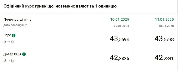 Национальный банк Украины (НБУ) снова повысил курс доллара к гривне. Доллар обновил шестой исторический максимум подряд, но рост замедлился. Об этом сообщает РБК-Украина со ссылкой на данные на сайте регулятора. Официальный курс на 13 января 2025 года установлен на таком уровне: 42,2841 гривен за 1 доллар (+0,0016 грн). Предыдущий максимум был 10 января 2024 года 42,2825 гривен за 1 доллар. Официальный курс евро составит 43,5738 гривен за 1 евро (+0,0144 грн).