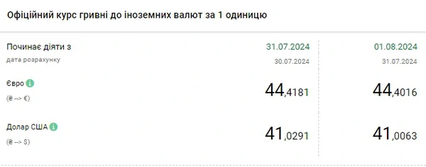 Национальный банк Украины (НБУ) снизил курс доллара к гривне. Доллар дешевеет уже восьмой банковский день подряд. Об этом сообщает РБК-Украина со ссылкой на данные на сайте регулятора. Официальный курс на 1 августа 2024 года установлен на таком уровне: 41,0063 гривен за 1 доллар (-0,0228 грн). Курс евро составит 44,4016 гривен за 1 евро (-0,0165 грн).