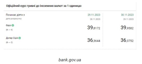 Национальный банк Украины (НБУ) снова повысил курс доллара. Доллар дорожает четвертый день подряд. Об этом сообщает РБК-Украина со ссылкой на данные на сайте регулятора. Официальный курс на 30 ноября 2023 года установлен на таком уровне: 36,3752 гривен за 1 доллар (+0,0108 грн). Курс евро составит 39,9582 гривен за 1 евро (+0,1410 грн). На межбанке сегодня курс вырос на 1 копейку до 36,38-36,40 грн/доллар (покупка-продажа). На наличном рынке курс не изменился - 37,60 гривен за доллар. | |