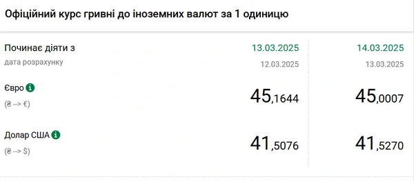Национальный банк Украины (НБУ) повысил курс доллара к гривне. Доллар дорожает четвертый день подряд, но рост замедлился. Об этом сообщает РБК-Украина со ссылкой на данные на сайте регулятора. Официальный курс на 14 марта 2025 года установлен на таком уровне: 41,527 гривен за 1 доллар (+0,0194 грн). Официальный курс евро составит 45,0007 гривен за 1 евро (-0,1637 грн).