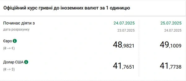 Национальный банк Украины (НБУ) немного повысил курс доллара к гривне. Единая европейская валюта подорожала. Об этом сообщает РБК-Украина со ссылкой на данные на сайте регулятора. Официальный курс на 25 июля 2025 года установлен на таком уровне: 41,7738 гривен за 1 доллар (+0,0087 грн). Официальный курс евро составит 49,1009 гривен за 1 евро (+0,1188 грн).