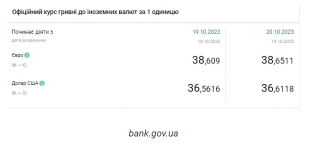Национальный банк Украины (НБУ) снова повысил официальный курс доллара. Курс снова превысил уровень, который был до перехода в режим управляемой гибкости (36,57 грн/доллар). Об этом сообщает РБК-Украина со ссылкой на данные на сайте регулятора. Официальный курс гривны к доллару на 20 октября 2023 года установлен на таком уровне: 36,6118 гривен за 1 доллар (+0,0502 грн). Курс евро составит 38,6511 гривен за 1 евро (+0,0421 грн). | |