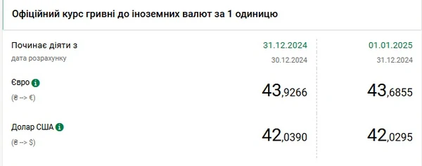Национальный банк Украины (НБУ) снизил курс доллара к гривне. Доллар подешевел после исторического максимума. Об этом сообщает РБК-Украина со ссылкой на данные на сайте регулятора. Официальный курс на 1 января 2025 года установлен на таком уровне: 42,0295 гривен за 1 доллар (-0,0095 грн). Официальный курс евро составит 43,6855 гривен за 1 евро (-0,2411 грн).