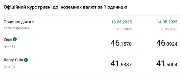 Национальный банк Украины (НБУ) снизил курс доллара к гривне. Курс единой европейской валюты также снизился. Об этом сообщает РБК-Украина со ссылкой на данные на сайте регулятора. Официальный курс на 14 мая 2025 года установлен на таком уровне: 41,5004 гривен за 1 доллар (-0,0383 грн). Официальный курс евро составит 46,0924 гривен за 1 евро (-0,0654 грн).