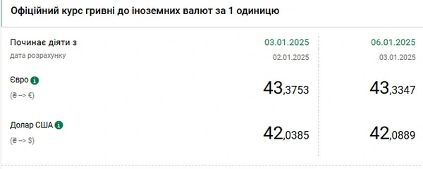 Национальный банк Украины (НБУ) повысил курс доллара к гривне. Доллар обновил первый исторический максимум в этом году. Об этом сообщает РБК-Украина со ссылкой на данные на сайте регулятора. Официальный курс на 6 января 2025 года установлен на таком уровне: 42,0889 гривен за 1 доллар (+0,0504 грн). Предыдущий максимум был 31 декабря 2024 года - 42,039 гривен за 1 доллар. Официальный курс евро составит 43,3347 гривен за 1 евро (-0,0406 грн).