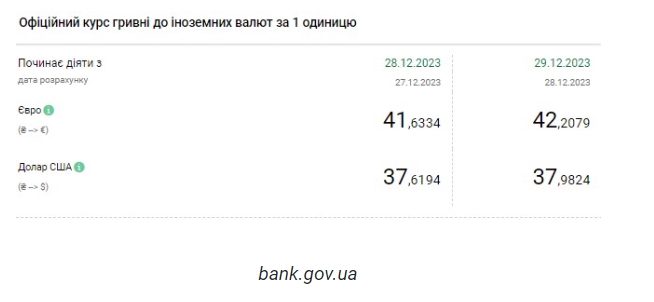 Национальный банк Украины (НБУ) резко повысил курс доллара на последний рабочий день 2023 года. Доллар подорожал до нового исторического максимума. Об этом сообщает РБК-Украина со ссылкой на данные на сайте регулятора. Официальный курс на 29 декабря 2023 года установлен на таком уровне: 37,9824 гривен за 1 доллар (+0,3630 грн). Курс евро составит 42,2079 гривен за 1 евро (+0,5745 грн). Это исторический максимум. Однако курс определяется котировками пары евро/доллар на международном рынке и не зависит от НБУ. На межбанке сегодня курс вырос на 31 копейку до 38,00-38,02 грн/доллар (покупка-продажа). На наличном рынке курс вырос на 30 копеек до 38,40 грн/доллар. | |