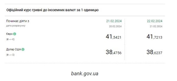 Национальный банк Украины (НБУ) повысил курс доллара. Доллар третий день подряд обновил исторический максимум. Об этом сообщает РБК-Украина со ссылкой на данные на сайте регулятора. Официальный курс на 22 февраля 2024 года установлен на таком уровне: 38,6237 гривен за 1 доллар (+0,1481 грн). Выше курс был только накануне - 38,4756 гривен за доллар. Курс евро составит 41,7213 гривен за 1 евро (+0,1792 грн). На межбанке сегодня курс вырос на 10 копеек до 38,62-38,65 грн/доллар (покупка-продажа) по сравнению с закрытием в предыдущий день. На наличном рынке курс вырос на 10 копеек до 38,80 грн/доллар. | |