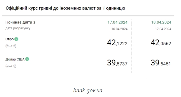 Национальный банк Украины (НБУ) снизил курс доллара к гривне. Доллар упал после достижения исторического максимума. Об этом сообщает РБК-Украина со ссылкой на данные на сайте регулятора. Официальный курс на 18 апреля 2024 года установлен на таком уровне: 39,5451 гривен за 1 доллар (-0,0286 грн). Курс евро составит 42,0562 гривен за 1 евро (-0,0660 грн). На межбанке сегодня курс вырос на 2 копейки до 39,57-39,60 грн/доллар (покупка-продажа) по сравнению с закрытием в предыдущий день. На наличном рынке курс вырос на 5 копеек до 39,80 грн/доллар. | |