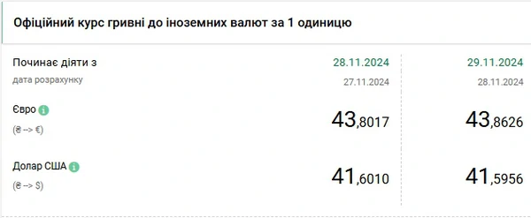 Национальный банк Украины (НБУ) снизил курс доллара к гривне. Доллар подешевел после того, как два дня подряд обновлял максимумы. Об этом сообщает РБК-Украина со ссылкой на данные на сайте регулятора. Официальный курс на 29 ноября 2024 года установлен на таком уровне: 41,5956 гривен за 1 доллар (-0,0054 грн). Официальный курс евро составит 43,8626 гривен за 1 евро (+0,0609 грн).