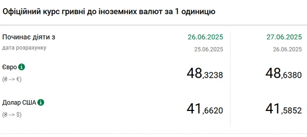 Национальный банк Украины (НБУ) снизил курс доллара к гривне. Курс евро снова обновил исторический максимум. Об этом сообщает РБК-Украина со ссылкой на данные на сайте регулятора. Официальный курс на 27 июня 2025 года установлен на таком уровне: 41,5852 гривен за 1 доллар (-0,0768 грн). Официальный курс евро составит 48,638 гривен за 1 евро (+0,3142 грн). Предыдущий максимум был зафиксирован 25 июня - 48,5084.