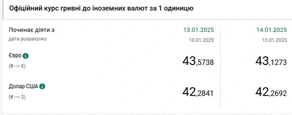 Национальный банк Украины (НБУ) снизил курс доллара к гривне. Доллар подешевел после шести дней роста, когда он непрерывно обновлял максимумы. Об этом сообщает РБК-Украина со ссылкой на данные на сайте регулятора. Официальный курс на 14 января 2025 года установлен на таком уровне: 42,2692 гривен за 1 доллар (-0,0149 грн). Официальный курс евро составит 43,1273 гривен за 1 евро (-0,4465 грн).