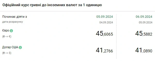 Национальный банк Украины (НБУ) снизил курс доллара к гривне. Доллар подешевел после трех дней роста. Об этом сообщает РБК-Украина со ссылкой на данные на сайте регулятора. Официальный курс на 6 сентября 2024 года установлен на таком уровне: 41,0890 гривен за 1 доллар (-0,1876 грн). Курс евро составит 45,5882 гривен за 1 евро (-0,0183 грн).