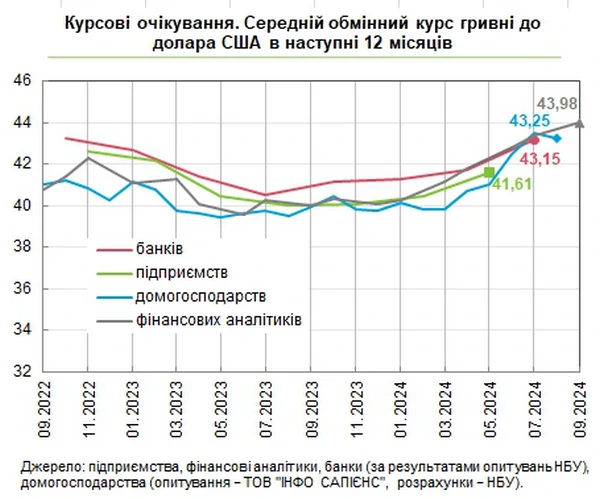 Девальвационные ожидания ухудшаются. Финансовые аналитики, банкиры, руководители предприятий прогнозируют рост курса доллара по отношению к гривне в течение следующих 12 месяцев. Об этом сообщает РБК-Украина со ссылкой на данные на сайте НБУ. По информации НБУ, в сентябре финансовые аналитики ожидают курс 43,98 грн/доллар. Это выше, чем предыдущий прогноз за август (43,36 грн/доллар). Банкиры в июле прогнозировали курс на уровне 43,15 грн/доллар. Это выше, чем предыдущий прогноз за апрель (41,69 грн/доллар). Население в августе прогнозировало курс на уровне 43,25 грн/доллар. Это несколько ниже, чем в июле 43,50 грн/доллар. Руководители предприятий ждут курс на уровне 41,61 грн/доллар (данные за май). Курс в бюджете УкраиныНапомним, Кабмин в бюджетной декларации на 2025-2027 годы заложил среднее значение курса доллара в 2025 году на уровне 45,0 грн/доллар и 45,6 грн/доллар в декабре. Законом о государственном бюджете на 2024 год определен средний курс на уровне 40,7 грн/доллар и 42,1 грн/доллар на конец года. Однако этот курс не является ни целью, ни прогнозом для НБУ, который определяет, каким будет курс. | |