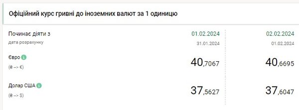 Национальный банк Украины (НБУ) повысил курс доллара. Доллар подорожал после резкого падения накануне. Об этом сообщает РБК-Украина со ссылкой на данные на сайте регулятора. Официальный курс на 2 февраля 2024 года установлен на таком уровне: 37,6047 гривен за 1 доллар (+0,0420 грн). Курс евро составит 40,6695 гривен за 1 евро (-0,0372 грн). На межбанке сегодня курс вырос на 5 копеек до 37,60-37,63 грн/доллар (покупка-продажа) по сравнению с закрытием в предыдущий день. На наличном рынке курс упал на 5 копеек до 38,20 грн/доллар. | |