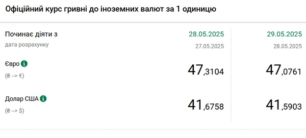 Национальный банк Украины (НБУ) снизил курс доллара к гривне. Доллар подешевел после роста в течение четырех дней подряд. Об этом сообщает РБК-Украина со ссылкой на данные на сайте регулятора. Официальный курс на 29 мая 2025 года установлен на таком уровне: 41,5903 гривен за 1 доллар (-0,0855 грн). Официальный курс евро составит 47,0761 гривен за 1 евро (-0,2343 грн).